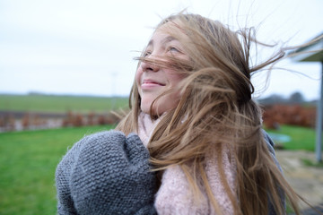 Portrait of smiling girl with blowing hair in winter looking up
