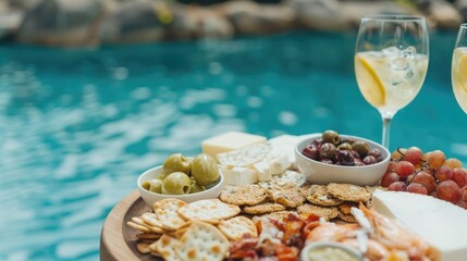 Relaxing poolside picnic with refreshing drinks and snack platter