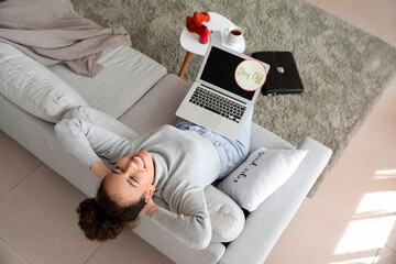 Asian woman relaxing with laptop at home