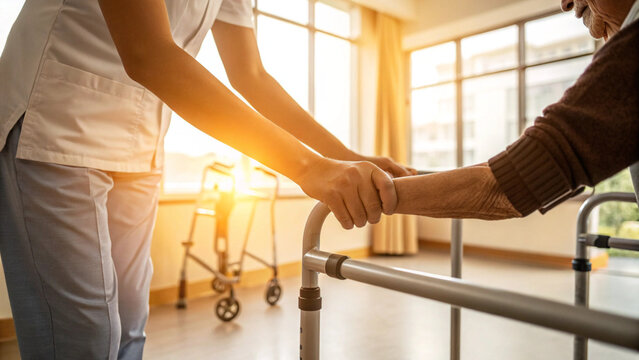 Family cheering as a loved one relearns to walk during rehab, comprehensive care, shared encouragement