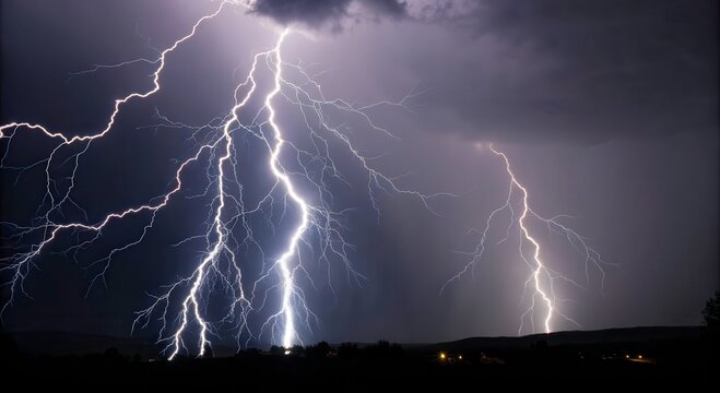 A dramatic display of nature's power is captured in this image, showcasing dark storm clouds illuminated by bright lightning bolts during a thunderstorm, emphasizing the raw beauty