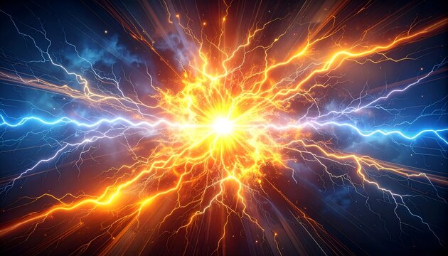 Intense energy release orange and blue lightning bolts converging at a bright central source