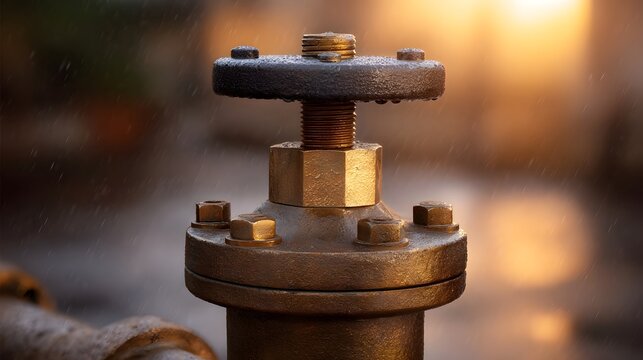 An industrial steam release valve with glistening bolts set against a blurred background during golden hour on a rainy day