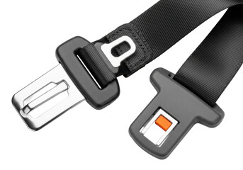 Unbuckled car seat belt with black textured webbing, reflective silver latch plate, dark grey buckle receiver, and vibrant orange release button, on a transparent isolated background with no