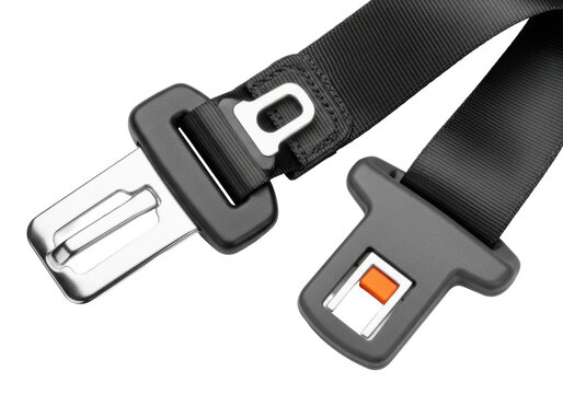 A selective focus close-up of a car seatbelt mechanism. The vibrant red release button is in sharp focus, while the metal tongue is blurred in the background, symbolizing road safety.
