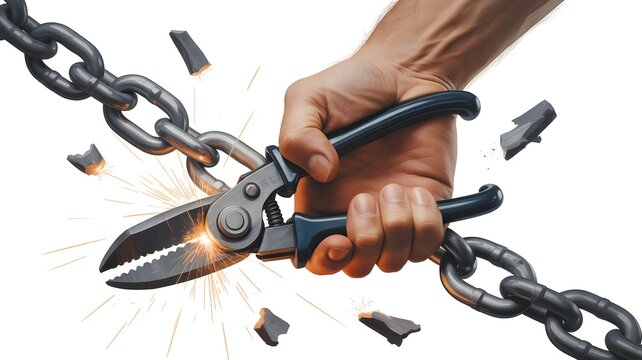 A strong hand uses bolt cutters to break a metal chain, symbolizing freedom, overcoming obstacles, and achieving success isolated on white background