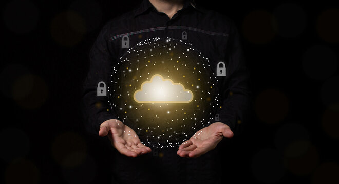 A businessman holds in his hands a projection of the global Internet network and a cloud storage system. The concept of secure storage of information on the Internet.