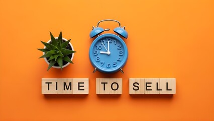 Overhead view of wooden letter blocks spelling out time to sell next to a blue vintage alarm clock and a small potted succulent against a vibrant orange background symbolizing urgency in finance