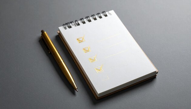 A spiral-bound notepad with five horizontal lines, each marked by a yellow checkmark, sits beside a black and gold pen on a smooth gray surface, symbolizing task completion and organized productivity.