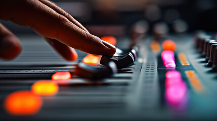Close-Up of DJ Hand Adjusting Sound Mixer with Colorful Party Lights in Background