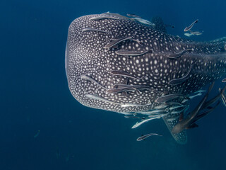 Whaleshark (Rhincodon typus) with remora fish on the blue background in South East Asia, Thailand, Koh Tao, Gulf of Thailand.