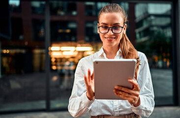 Beautiful adult modern smiling business woman in glasses holding a tablet and working on it. Online technologies, remote work, training, courses.Social communications and advertising. Copy space.