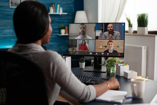 Worker using video call communication with colleagues to do business meeting and remote work on computer. Adult talking about project on online video conference on internet connection.