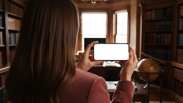Hand holding mobile phone in landscape mode with blank white screen mockup in classic luxury library home office, professional woman using smartphone for digital learning app design.