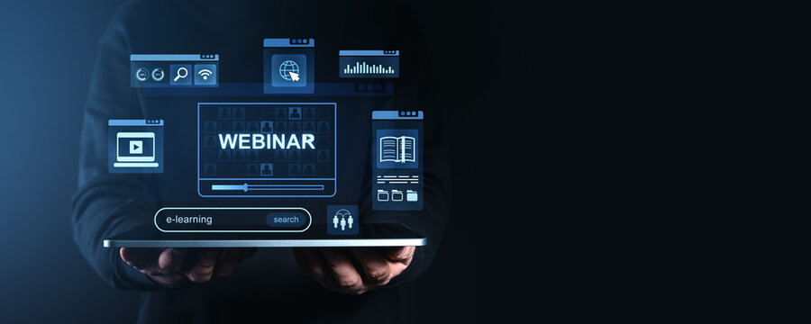 Webinar and e-learning icons over tablet representing online education and technology concept.