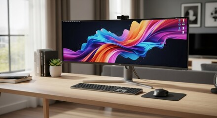 Ultrawide computer monitor on a wooden desk with keyboard and mouse for remote work or home office setup concept.