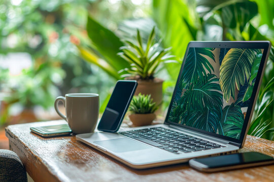 A modern workspace with a laptop, smartphone, and coffee cup on a wooden desk, surrounded by green plants. A cozy and inspiring setup for remote work, creativity, and productivity.