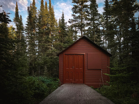 A wooden bridge walkway leads to a rustic red shed in the middle of an old growth forest. Tall pine and evergreen trees and green plants surround the shed. Feels very remote