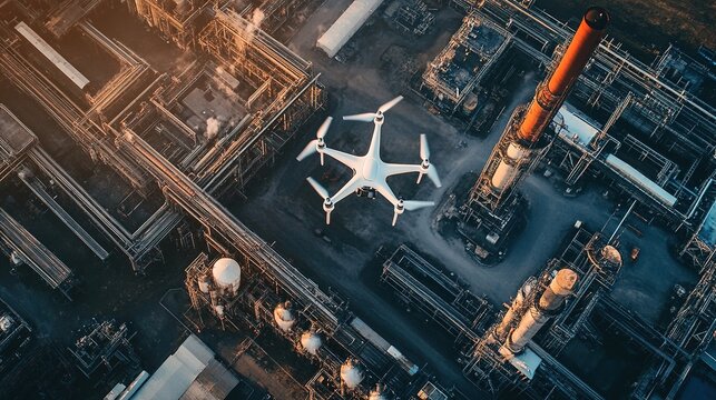Drone flying over industrial scene at dusk