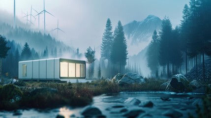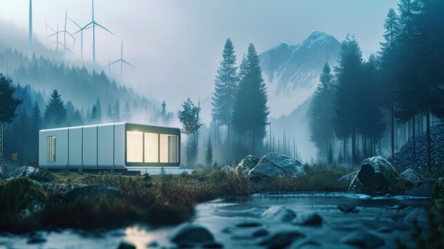 Energy storage unit in a remote forest location, ecofriendly power theme, side view, highlighting renewable energy solutions, digital tone, vivid