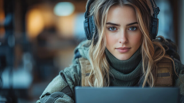 Woman working on laptop with dashboard overlays holding coffee cup, remote work analytics