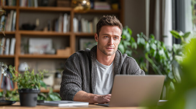 Focused professional working remotely on laptop at home office