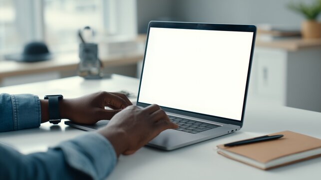 Hands typing on laptop computer with blank screen mockup modern office desk setting technology for productivity and online business concepts professional remote worker using