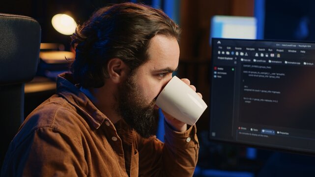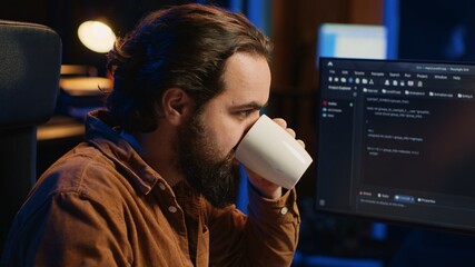 Focused programmer drinking coffee in apartment while solving database errors on computer. Remotely working IT admin concentrated on finalizing coding project in home office, camera A