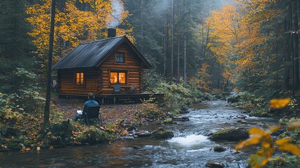 Serene Digital Nomad Lifestyle in Rustic Wooden Cabin Surrounded by Nature