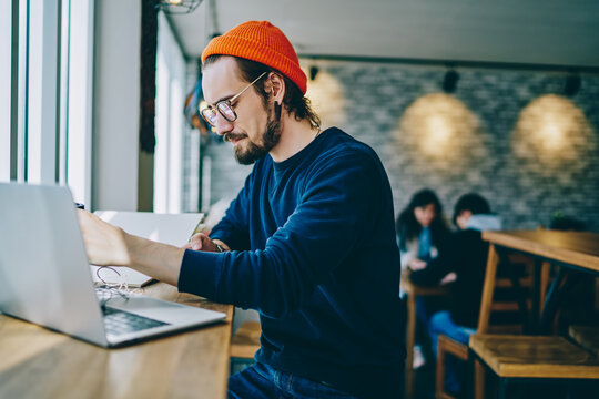 Millennial hipster guy in trendy spectacles sitting at cafeteria table with modern laptop computer, skilled Caucasian freelancer working remotely with web blog spending time in coworking space