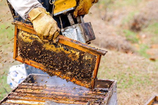Close-up. Scene of a beekeeper removing a honeycomb from a wooden box to examine the health of the bees.