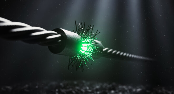 A digital rendering of a frayed cable with a luminous green core symbolizes fragility. This image evokes concepts of vulnerability, brokenness, and the intricate connections.