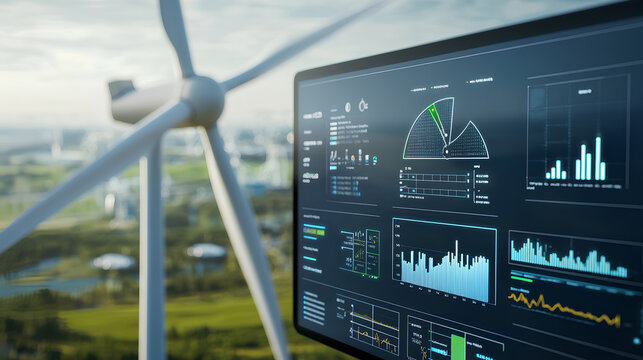 Modern wind turbine with a detailed energy data analytics dashboard in the foreground, displaying real-time statistics and graphs for effective power production monitoring