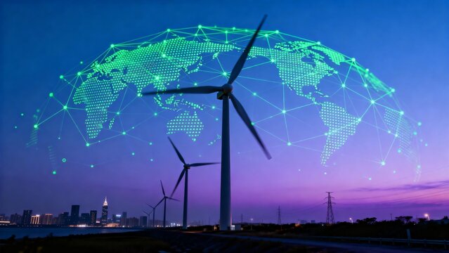 A futuristic dashboard displaying data analytics and graphs, with wind turbines in the background, emphasizing renewable energy and technology.