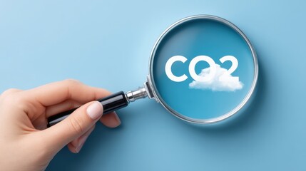 Greenhouse gas control. Magnifying glass focusing on CO2 emissions with clouds on a blue background.