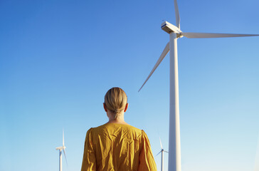 A person living in a sustainable city that is powered by renewable energy. Energy from wind, from sunlight or solar cells is pure energy that will be used in the future.