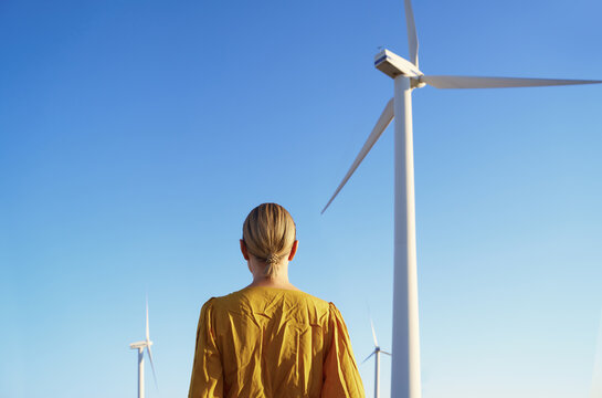 Golden Gaze: A thoughtful gaze of a woman, framed by a giant turbine, as the setting sun casts a warm, ethereal light.