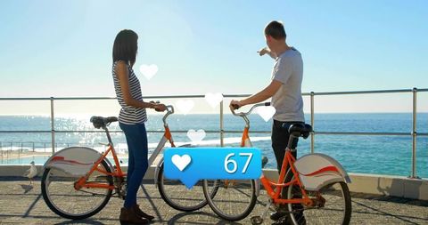 Couple standing with orange rental bikes by seaside pointing toward ocean horizon with hearts