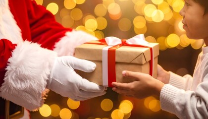 Hands tenderly exchange beautifully wrapped gifts beneath the soft glow of holiday lights, celebrating the season of giving, generosity, and joy.