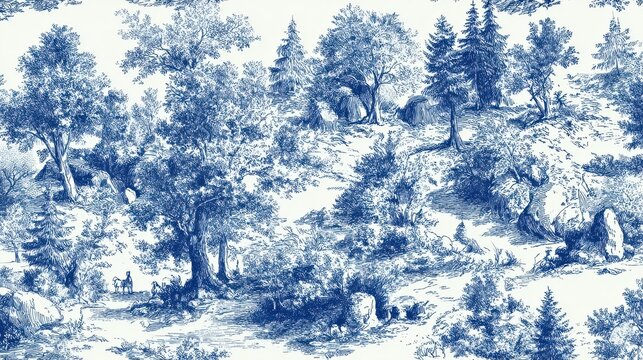 toile wilderness forest countryside seamless pattern texture wallpaper background blue ink