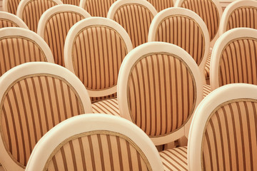 Stylish peach orange sunglasses on beige, minimal trend repeated pattern, sunlight shadow, summer fashion white transparent-framed glasses. Top view of rows of lying eyewear, beach concept