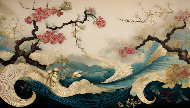 Wreath-style floral arrangement repeated in symmetrical rows across a pastel base