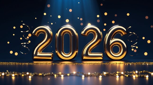 Shiny golden 2026 year balloons illuminated by spotlights against dark blue festive background with bokeh lights for new year celebration concept