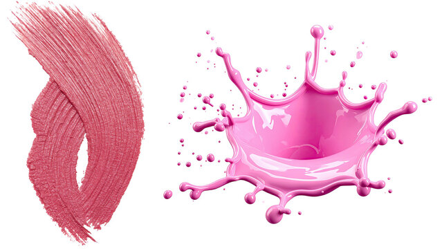 Pink lipstick brush stroke and liquid splash on white background