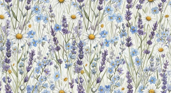 A repeating pattern of daisies, forget me nots and lavender flowers on a white background artwork