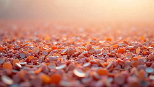 Reddish-orange plastic pellets glow in warm light—precision, abundance, and the quiet pulse of industry.