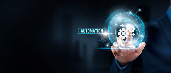 Automation: Streamlining Operations, Businessman Touches Automation Icon and Global Network. Efficiency, Innovation.