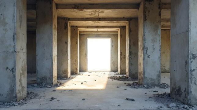 Revealing vast empty warehouse interior with steel columns, skylights, symmetrical trusses