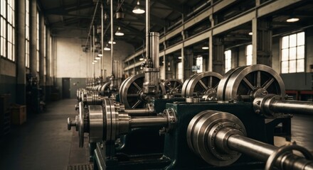 Industrial machinery lines in a vast factory space with hanging light fixtures