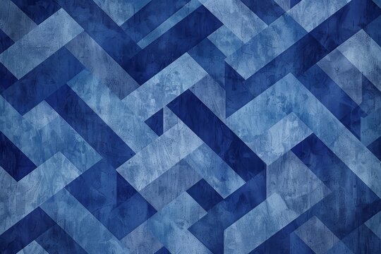 Blue background featuring a pattern of squares arranged in a geometric design, A geometric pattern of overlapping blue shapes on a textured blue background